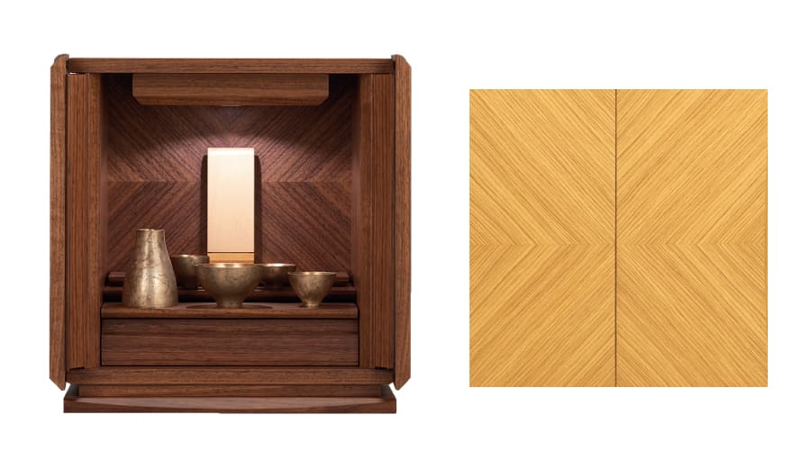 扉と背面に、弓矢の羽根のように突板を斜めに貼り合わせた「矢貼り」のデザインを採用。